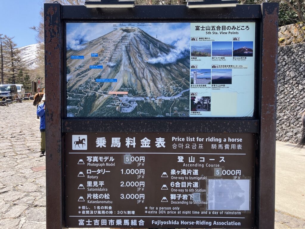 馬に乗りました。料金は距離によるものだと思いまして、乗馬自体初めてでしたし長い時間は大変そうだったので2,000円のものにしました。5,000円だと約30分ほどらしいです。良い体験になりました。馬の手綱を握るスタッフ、馬、私で行って、里見平?の到着したところで山中湖と河口湖を背景に写真を撮ってくれました。良いスタッフでした。前日(5月15日)は積雪があって。5合目は閉鎖、4合目までだったとのことです。