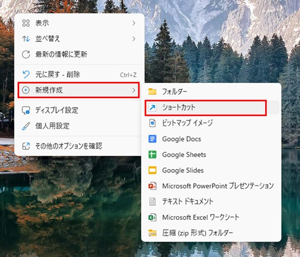 デスクトップを右クリック、「新規作成」をクリック、「ショートカット」をクリック。
