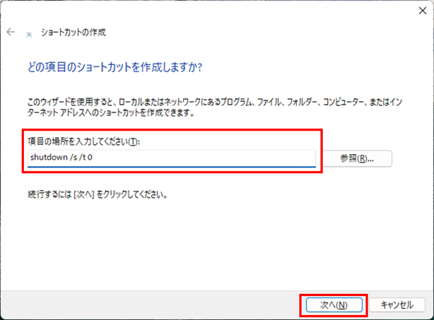 「項目の場所を入力してください」に電源操作のコマンドを入力、次へ。