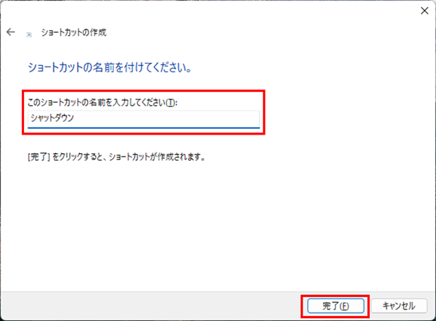 「このショートカットの名前を入力してください」に名前を入力、完了。