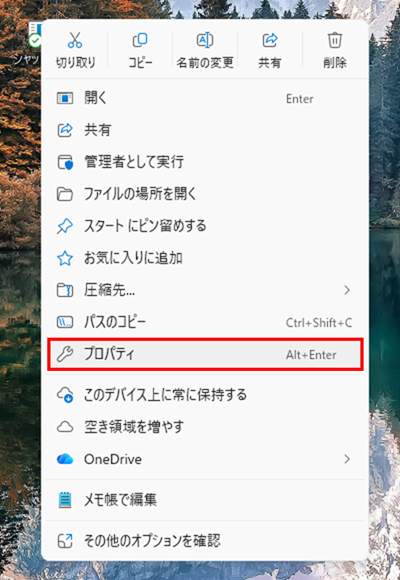 作成したショートカットを右クリック、「プロパティ」をクリック。