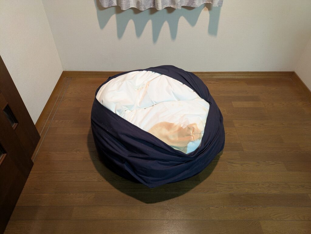 ただ、家に持ち帰ったあと、0円の理由がわかりました。カバーを外してみると汚れが凄かったです。恐らくコーヒーか何かをこぼしてどうしようもなくて放置していたのかな、という感じでしょうか。外側は洗濯しましたが、中身も洗濯したかったのですが調べてみてもどうもできそうにもなく、まあしゃーなしということで試してみます。